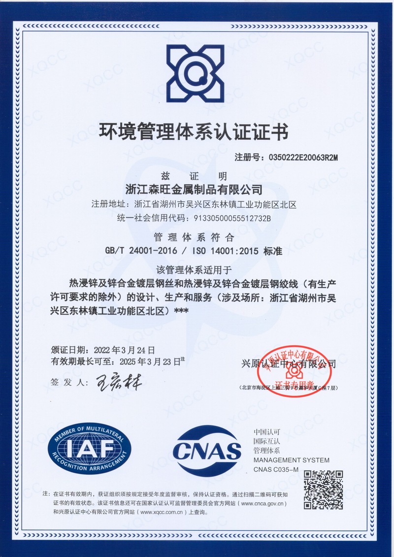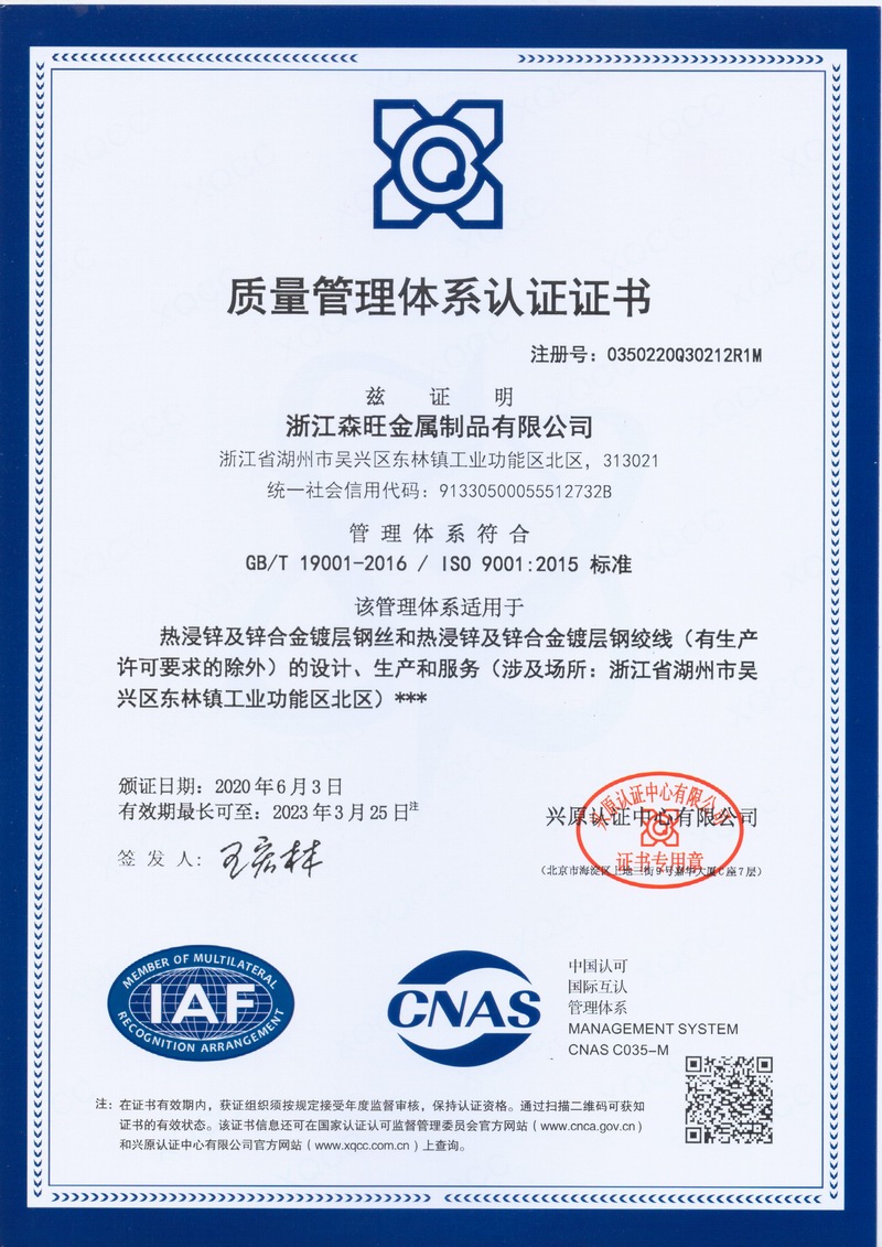 浙江森旺金屬制品有限公司成立于2012年,坐落湖州市吳興區(qū)東林鎮(zhèn)工業(yè)功能區(qū)。公司專(zhuān)業(yè)從事各類(lèi)鍍鋅鋼絲、鋼絞線等產(chǎn)品的開(kāi)發(fā)及生產(chǎn)。目前產(chǎn)品已廣泛應(yīng)用于各類(lèi)通信光電纜,電力輸送,電氣化鐵路工程,各類(lèi)堤壩防護(hù)及農(nóng)業(yè)溫室等工程領(lǐng)域。公司秉承“追求卓越品質(zhì),創(chuàng)建卓著信譽(yù)”的經(jīng)營(yíng)理念,始終堅(jiān)持專(zhuān)業(yè)化、規(guī)模化的經(jīng)營(yíng)模式。
